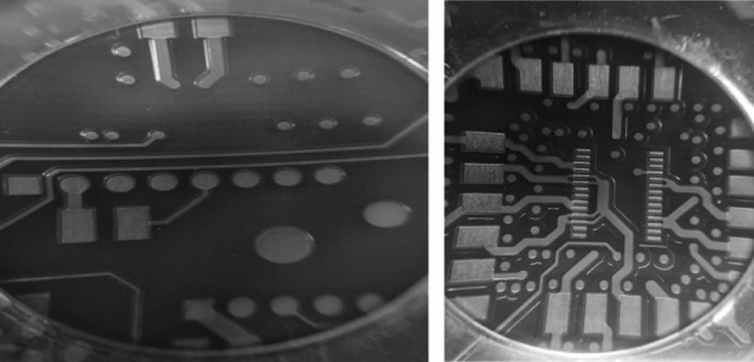 (2)最后一次阻焊制作。使用靜電噴涂或噴涂工藝生產(避免噴涂時阻焊入孔),阻焊曝光時使用正常的阻焊曝光底片資料生產,阻焊完成后的效果見圖1。