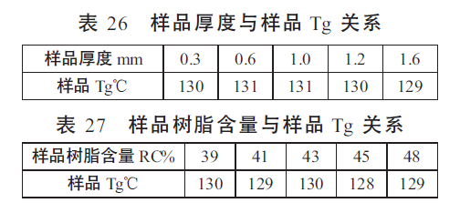 我們還考察了基板厚度, 基板樹脂含量,樣品存放時間對基板Tg 的影響情況。表26,表27 說明,不同基板厚度,不同樹脂含量,對基板的Tg 沒有什么影響(見)。但樣品存放時間對基板的Tg 有一定影響。隨著基板儲存時間延長,基板的Tg 將逐步降低。這與基板在存放過程吸濕有關(guān)。因此,覆銅板一定要做防潮包裝,特別對于高Tg 產(chǎn)品。